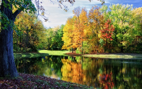 This scenic wallpaper has a beautiful view of tree lined river. The trees are just starting to change into their Autumn colors. |