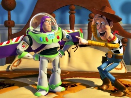 Disney watches - Find a Disney watch "You're mocking me, aren't you," are the words Buzz Lightyear says after Woody finishes making fun of him in the scene depicted on this Disney wallpaper. This wallpaper is based on the Disney / Pixar movie, Toy Story; about a toy cowboy, Woody, who feels he has been replaced by Andy’s new toy, Space Ranger Buzz Lightyear. |
