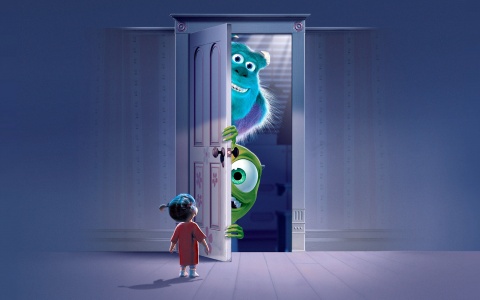 This wallpaper is based on the 2001 Pixar animated film, Monsters, Inc. Here Sulley and Mike Wazowski visit Boo through her closet door in her bedroom. |