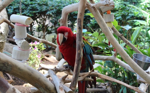 This computer wallpaper image was taken of a parrot this is on the grounds at the Hilton Hawaiian Village in Honolulu. There are 4 parrots on the grounds, each morning a handler brings them out to there separate perch areas scattered around the grounds. Then at night they are returned to their safe sleeping area.