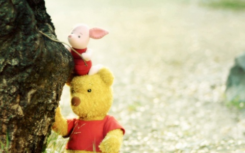 This Disney wallpaper is based on the A. A. Milne stories of Winnie the Pooh. Here a stuffed Pooh is helping Piglet to climb a tree. This image was found on Disney's Japan website and has been reformatted so that it can be used on many other devices. |