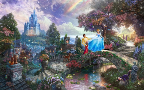 This Disney computer wallpaper shows off a painting of Thomas Kinkade's interpretation of Disney's 1950 animated film, Cinderella. Here you see the Cinderella and her Prince. Under the bridge are her two mice friends, Jaques and Gus. The cruel stepsisters are seen on the path to the right, while the famed pumpkin carriage can be seen leaving the castle on the left. This is one of Kinkade's paintings from the Disney Dreams Collection. |
